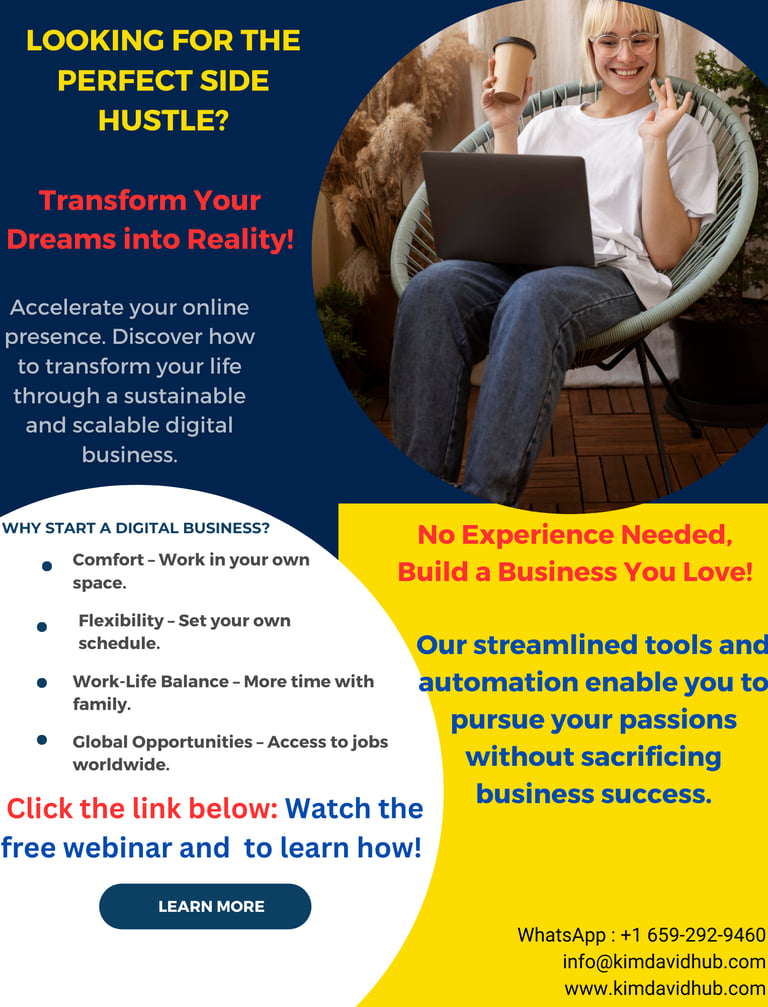 Visit our website now to learn more and start transforming your life with a career you can truly enjoy – from anywhere!...With just a phone, laptop, or desktop, and a Wi-Fi connection, you can start earning from anywhere in the world. Say goodbye to long commutes, rigid schedules, and unfulfilling routines. Imagine a life where you set your own hours, grow at your own pace, and achieve your financial goals – all while working remotely. We offer the tools, training, and support to help you succeed in digital marketing, one of the fastest-growing fields today. Whether you're a complete beginner or lookin sharpen your skills, we’ll guide you every step of the way. Your journey to a more rewarding life is just a click